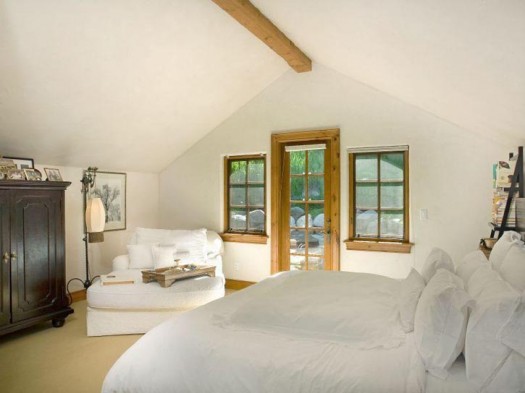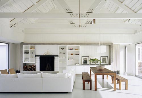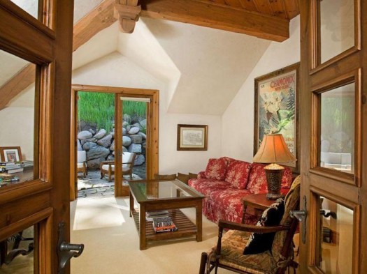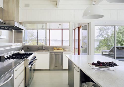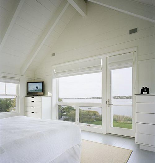 Вот современный коттедж, стиль архитектуры в основе которого лежит создание загородного дома у озера, для отдыха с близкими друзьями, включает в себя четыре небольших жилых пространства, интерьеры сочетают современный стиль, большие просторы стекла, окрашенная сосна, мастер спальня, профессиональная кухня, комната отдыха, камень, камин, а также лестницы.