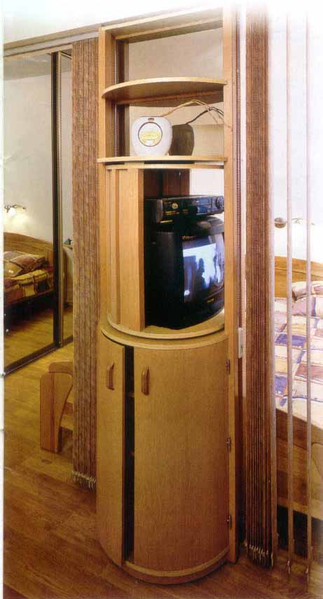 Такой вариант скорее подходит для жилья одиночки или семейной пары, не имеющей детей, но как же поступить, если у вас есть ребенок или вам необходимо место для уединения, или вас часто посещают друзья. Выход есть. В этом случае вместо типового набора: кухня и общая комната - выбирается кухня-столовая и спальня, или кабинет. Под них отводится часть созданного общего помещения, полученного опять же слиянием кухни и комнаты. Величину спальни вы легко высчитаете, если посмотрите таблицу соотношения кровати и спального места, которую мы недавно публиковали. Интересным элементом такой перепланировки может стать вертикальная вращающаяся стойка под телевизор, что позволит смотреть программы и находясь в постели, и готовя пищу.
