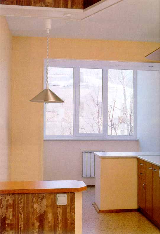 Часто о серьезной перепланировке не может быть и речи. Во-первых, из-за недостатка финансовых возможностей, во-вторых, по причине конструктивных особенностей квартиры, в которой все стены могут быть несущими. Но и в этом случае можно найти выход в проблеме расширения пространства. Небольшую кухню можно увеличить, например, за счет лоджии, присоединив ее к общей территории квартиры. Это сделать нетрудно, главное только хорошо утеплить лоджию. Что можно сделать способом так называемого ‘сэндвича’, состоящего из примыкающего к наружной стене слоя минеральной ваты, стенки в полкирпича, препятствующей образованию конденсата, и гипсолитового листа. Пол и потолок в свою очередь можно утеплить с помощью пенополиэтилена (ППЭ), пятимиллиметровый слой которого сравним по теплоизоляционным свойствам с ‘Изовером’. Четыре слоя ППЭ, разделенного листовым гипсокартоном, вполне подойдут для этого. Такую работу выполнить несложно, следует только получить разрешение в соответствующих инстанциях.