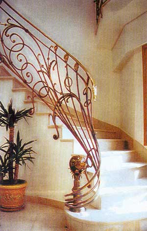 Однако истинный эксклюзив солидные люди для роскошных особняков заказывают французам. Мастер выезжает на объект, в какой бы точке мира он не находился, лично делает шаблон лестницы для создания ее ограждения. Когда всегда неповторимое произведение высокохудожественной ковки занимает предназначенное ему в доме место, лестница становится самой большой ценностью даже в антикварном интерьере.