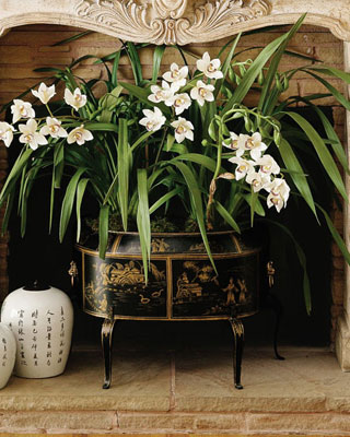 Более стойкого и длительного эффекта можно добиться, используя для этой цели сухоцветы: они не требуют замены по мере увядания и обходятся гораздо меньшей по объему поддерживающей "тарой". Только открытого солнца сухоцветы не любят - под его лучами они, хоть и медленно, но теряют свою окраску. На следующем фото представлена композиция в восточном стиле из горшечного растения и срезанных цветов орхидеи, дополненная ветками сухоцветов.