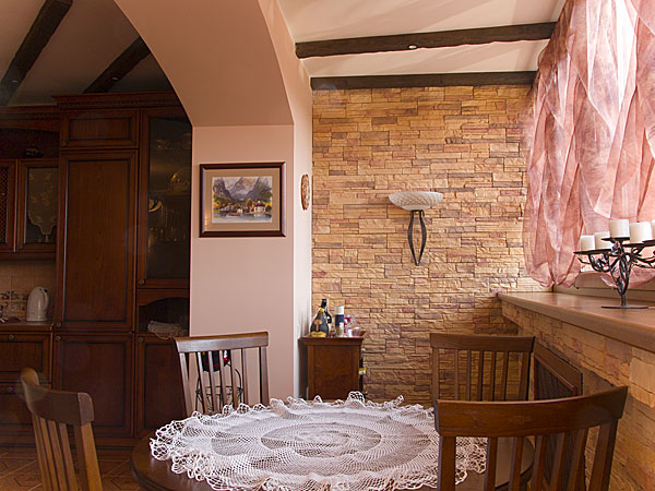 Она определяется исключительно вашей фантазией, поскольку камень прекрасно подойдет как для интерьера квартир, так и для экстерьера здания. Он замечательно сочетается с деревянными, окрашенными или оштукатуренными стенами, с коваными оградами, металлическими элементами лестниц и балконов. Им можно отделать гостиную, кухню, домашний кинотеатр, бассейн и камин, не забыв о дверных проемах и декоративных колоннах. Он украсит фасад, цоколь, крышу, печные и вентиляционные трубы, окна, балюстрады. Парапетные плиты, подпорные стены, русты по углам здания, декоративные вставки и пояса также можно выполнить из искусственного камня.